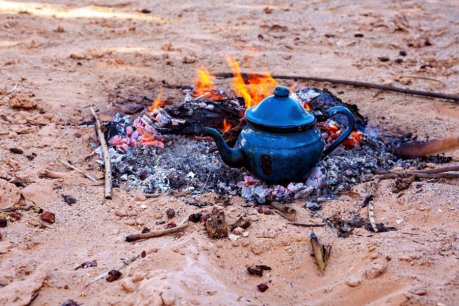 Kolem poledne si dopřejeme piknikový oběd v přírodě – jednoduché saharské jídlo z čerstvého chleba, datlí, zeleniny a sladkého mátového čaje, připravené našimi průvodci.
