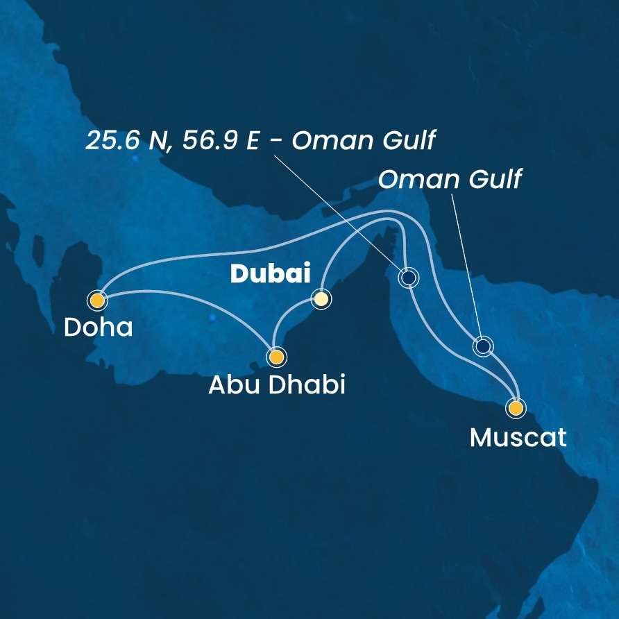 Dubaj (Arabské emiráty) - Dubaj (Arabské emiráty) - Dubaj (Arabské emiráty) - Muscat (Omán) - DOHA (Katar) - Abu Dhabí (Arabské emiráty) - Dubaj (Arabské emiráty).