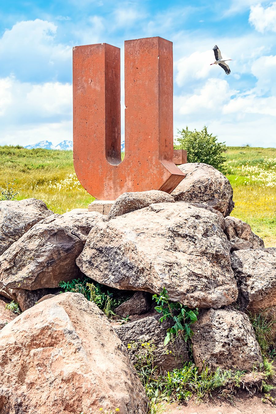 Poté navštívíme Arménskou abecedu Monument , na pozadí arménské Mt. Aragats. Monument byl postaven v roce 2005 jako vzpomínka na výročí arménské abecedy.