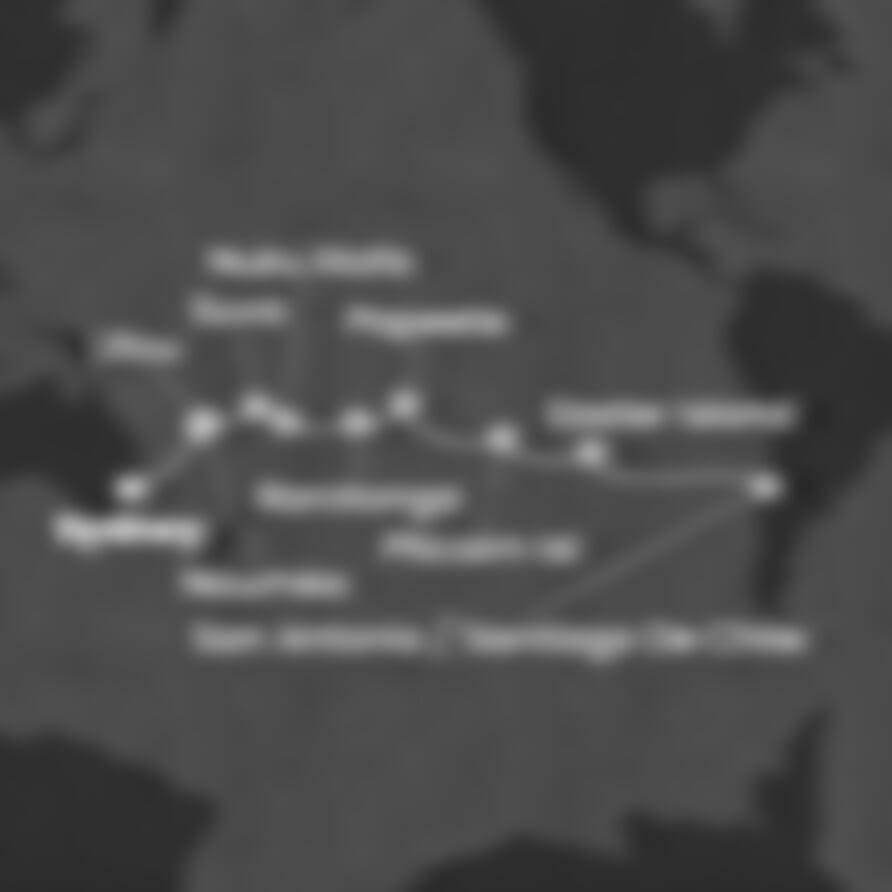 Sydney (Austrálie) - Nouméa (Nová Kaledonie) - LIFOU - Suva (Fidži) - Nuku'alofa (Tonga) - RAROTONGA - Papeete (Franc. Polynésie) - PITCAIRN ISL - Easter Island (Chile) - San Antonio (Chile).