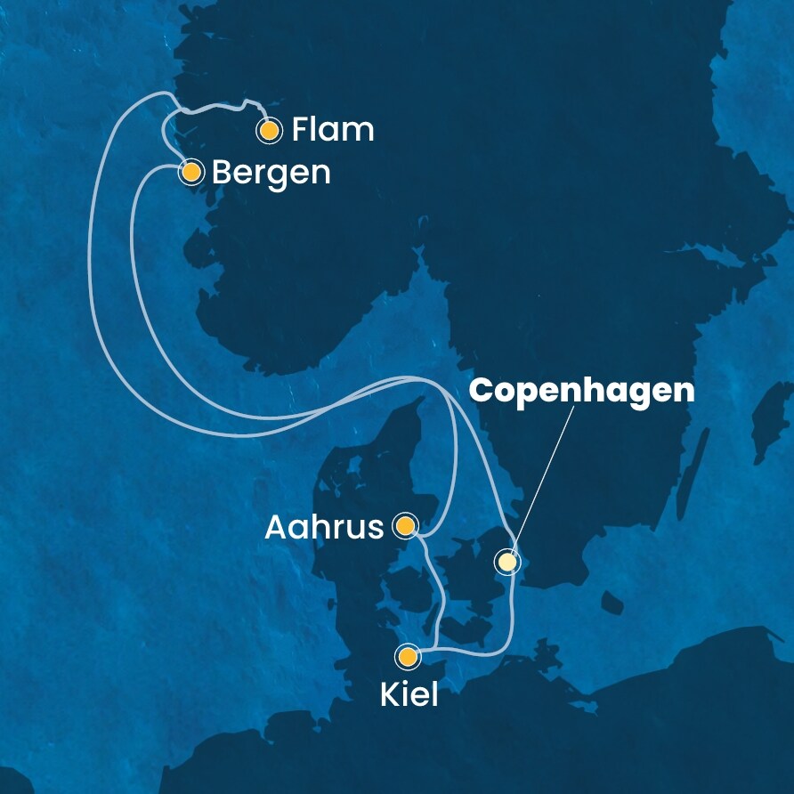 Kodaň (Dánsko) - Flam (Norsko) - Bergen (Norsko) - Aahrus (Dánsko) - Kiel (Německo) - Kodaň (Dánsko).