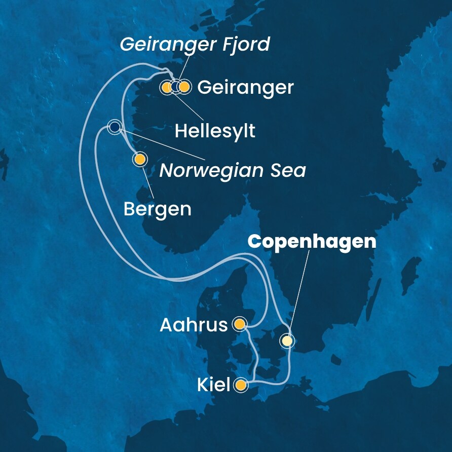 Kodaň (Dánsko) - Hellesylt (Norsko) - Geiranger (Norsko) - Bergen (Norsko) - Aahrus (Dánsko) - Kiel (Německo) - Kodaň (Dánsko).