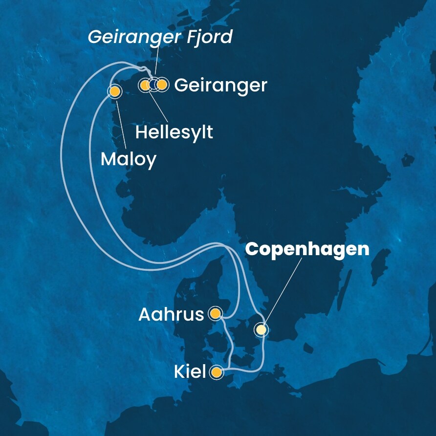Kodaň (Dánsko) - Hellesylt (Norsko) - Geiranger (Norsko) - Maloy (Norsko) - Aahrus (Dánsko) - Kiel (Německo) - Kodaň (Dánsko).