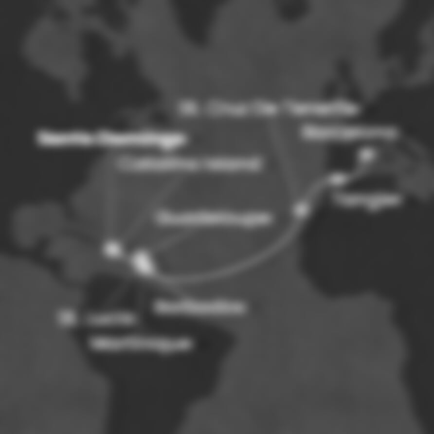 Santo Domingo (Dominikán.rep.) - Catalina Island (Dominikán.rep.) - Martinik (Nizozemské Antily) - Guadeloupe (Nizozemské Antily) - St. Lucia (Nizozemské Antily) - Barbados (Nizozemské Antily) - St. Cruz de Tenerife (Španělsko) - Tanger (Maroko) - Barcelona (Španělsko).