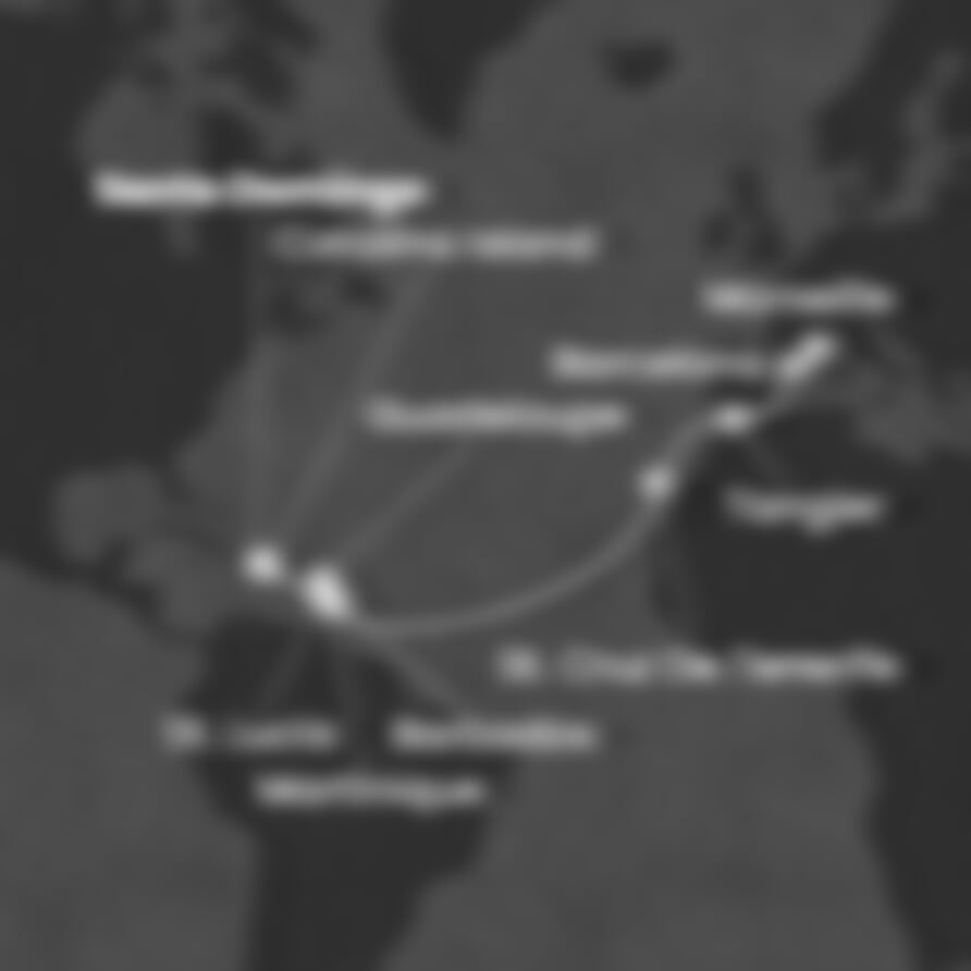 Santo Domingo (Dominikán.rep.) - Catalina Island (Dominikán.rep.) - Martinik (Nizozemské Antily) - Guadeloupe (Nizozemské Antily) - St. Lucia (Nizozemské Antily) - Barbados (Nizozemské Antily) - St. Cruz de Tenerife (Španělsko) - Tanger (Maroko) - Barcelona (Španělsko) - Marseille (Francie).
