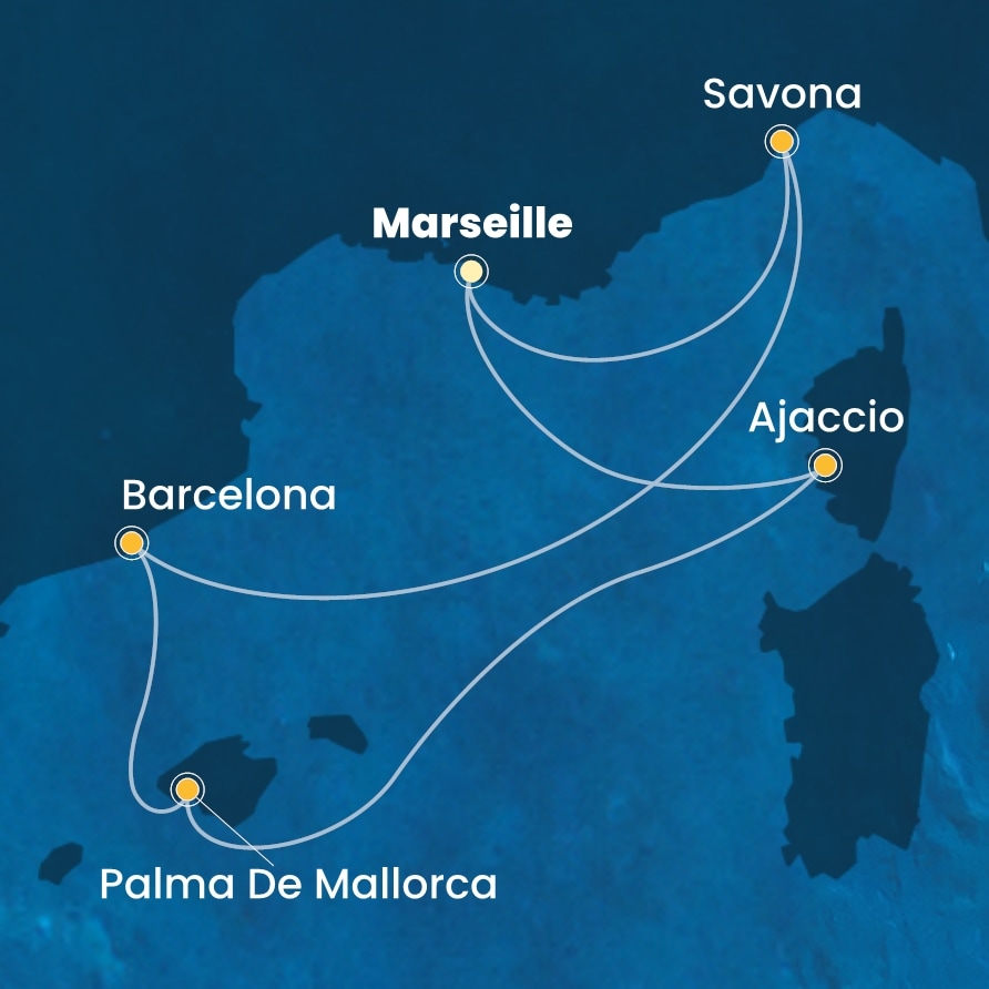 Marseille (Francie) - Savona (Itálie) - Barcelona (Španělsko) - Palma de Mallorca (Španělsko) - Ajaccio (Francie) - Marseille (Francie).