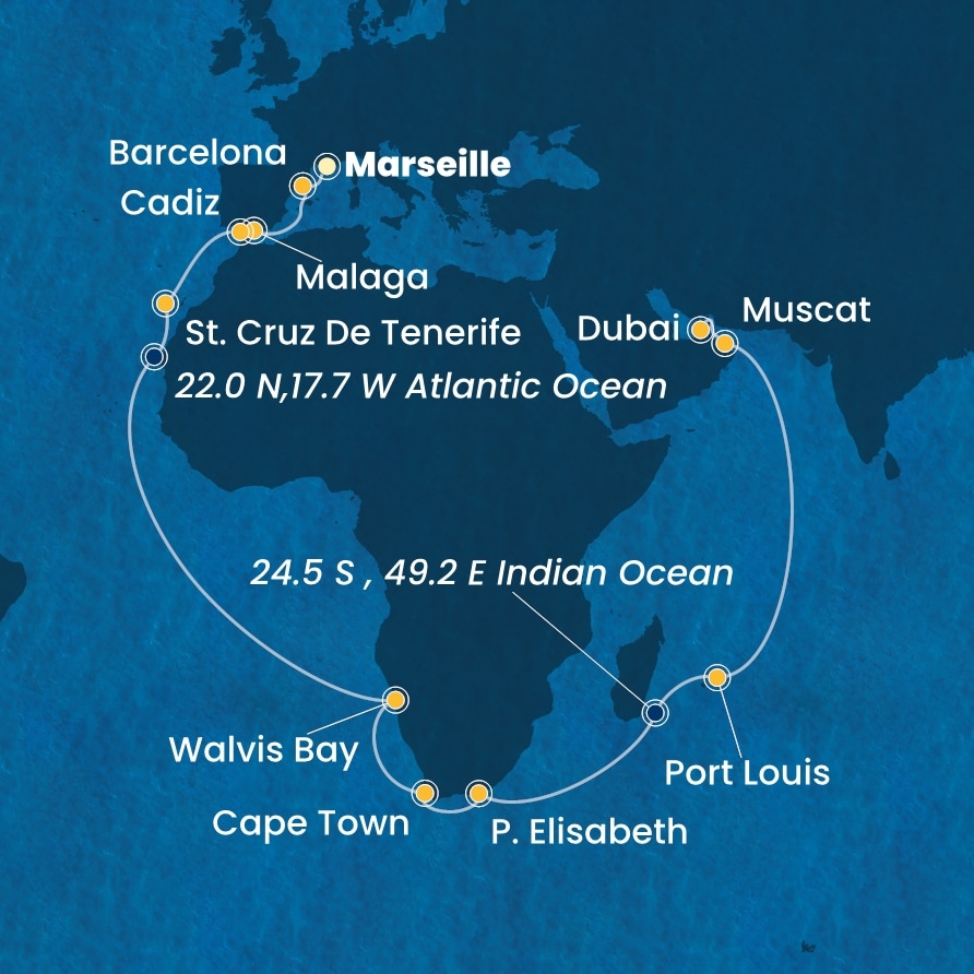 | 23. den | Port Elizabeth (Jihoafrická r.) | 07:00 | 15:00 |