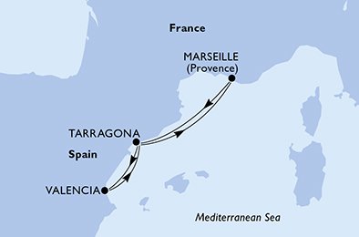 Marseille (Provence) (Francie) - Tarragona (Španělsko) - Valencia (Španělsko) - Tarragona (Španělsko) - Marseille (Provence) (Francie).