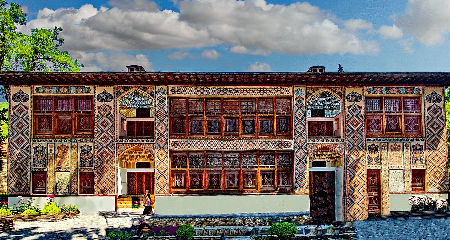 Jako první navštívíme Palác chánů (Šeki Khan Palace) , který je považován za jednu z nejkrásnějších památek v zemi. Byl postaven v 18. století a je proslulý barevnými vitrážemi (tzv. šebeke) , dřevěnými intarziemi a jemnými malbami na zdech. Stavba celého paláce byla realizována bez jediného hřebíku.