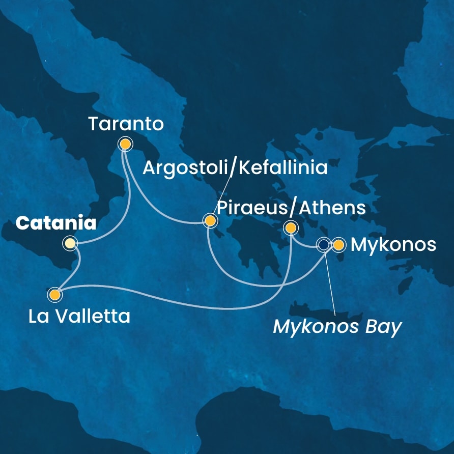 Catania (Itálie) - Taranto - Argostoli/Kefallinia (Řecko) - Mykonos (Řecko) - Pireus/Atény (Řecko) - La Valletta (Malta) - Catania (Itálie).