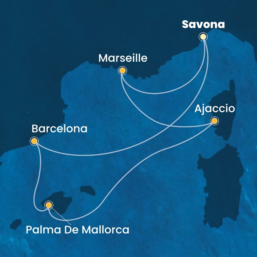 Savona (Itálie) - Barcelona (Španělsko) - Palma de Mallorca (Španělsko) - Ajaccio (Francie) - Marseille (Francie) - Savona (Itálie).