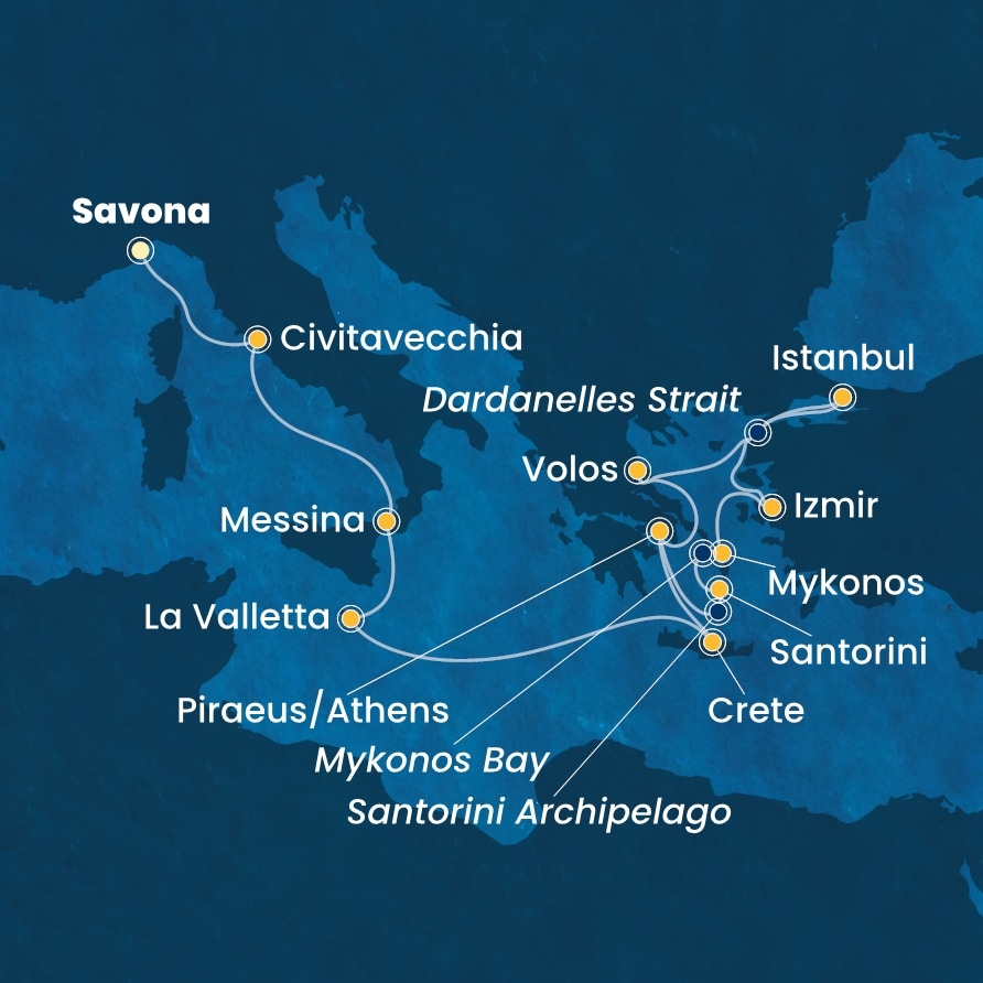 | 3. den | Messina (Itálie) | 14:00 | 20:00 |