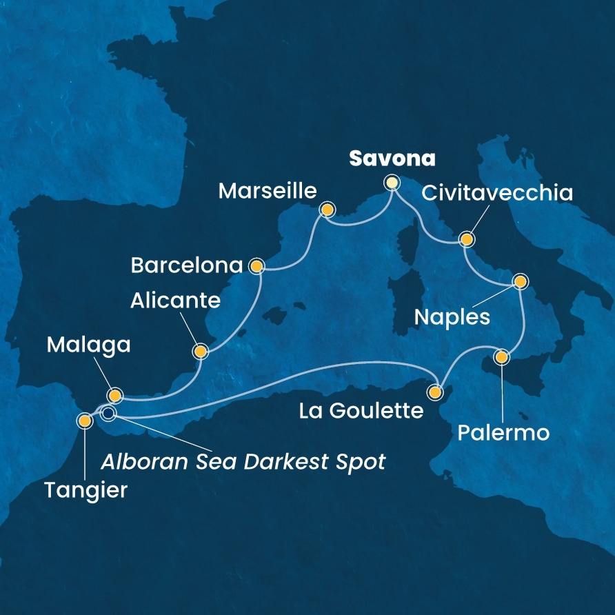 | 13. den | Savona (Itálie) | 08:30 | - |