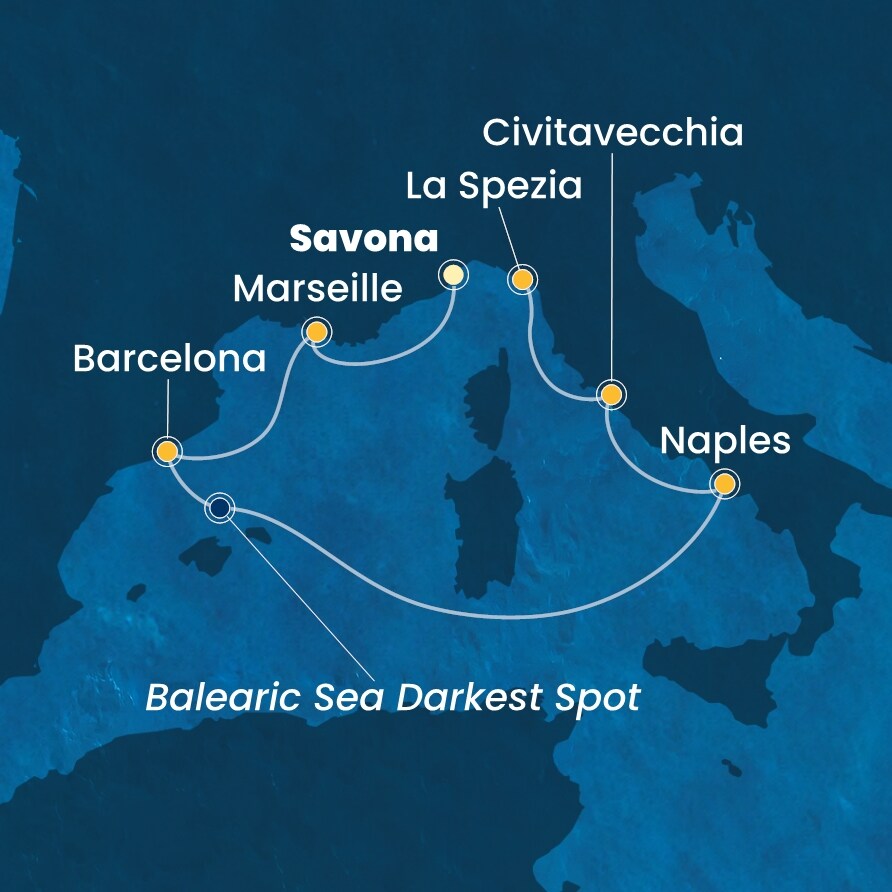 Savona (Itálie) - Marseille (Francie) - Barcelona (Španělsko) - Neapol (Itálie) - Civitavecchia (Itálie) - La Spezia (Itálie).