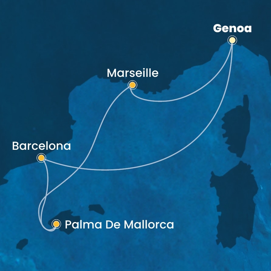 Janov (Itálie) - Barcelona (Španělsko) - Barcelona (Španělsko) - Palma de Mallorca (Španělsko) - Marseille (Francie) - Janov (Itálie).