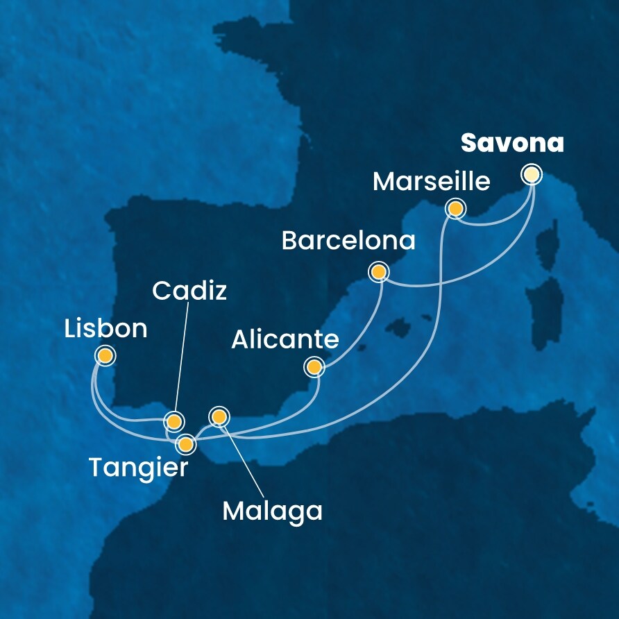 | 7. den | Tangier (Maroko) | 08:00 | 18:00 |