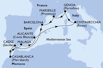 | 6. den | Casablanca (Maroko) | 06:00 | 20:00 |