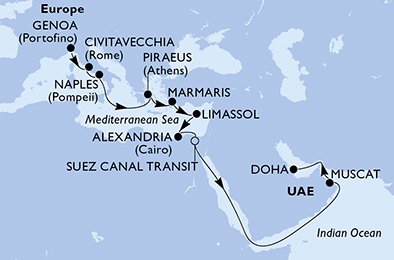 | 11. den | Suezský průplav (Egypt) | 15:00 | 15:30 |