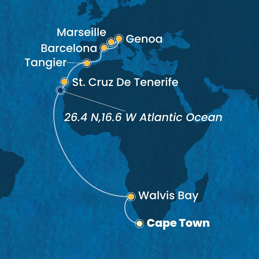 | 4. den | Walvis Bay (Namíbie) | 14:00 | - |