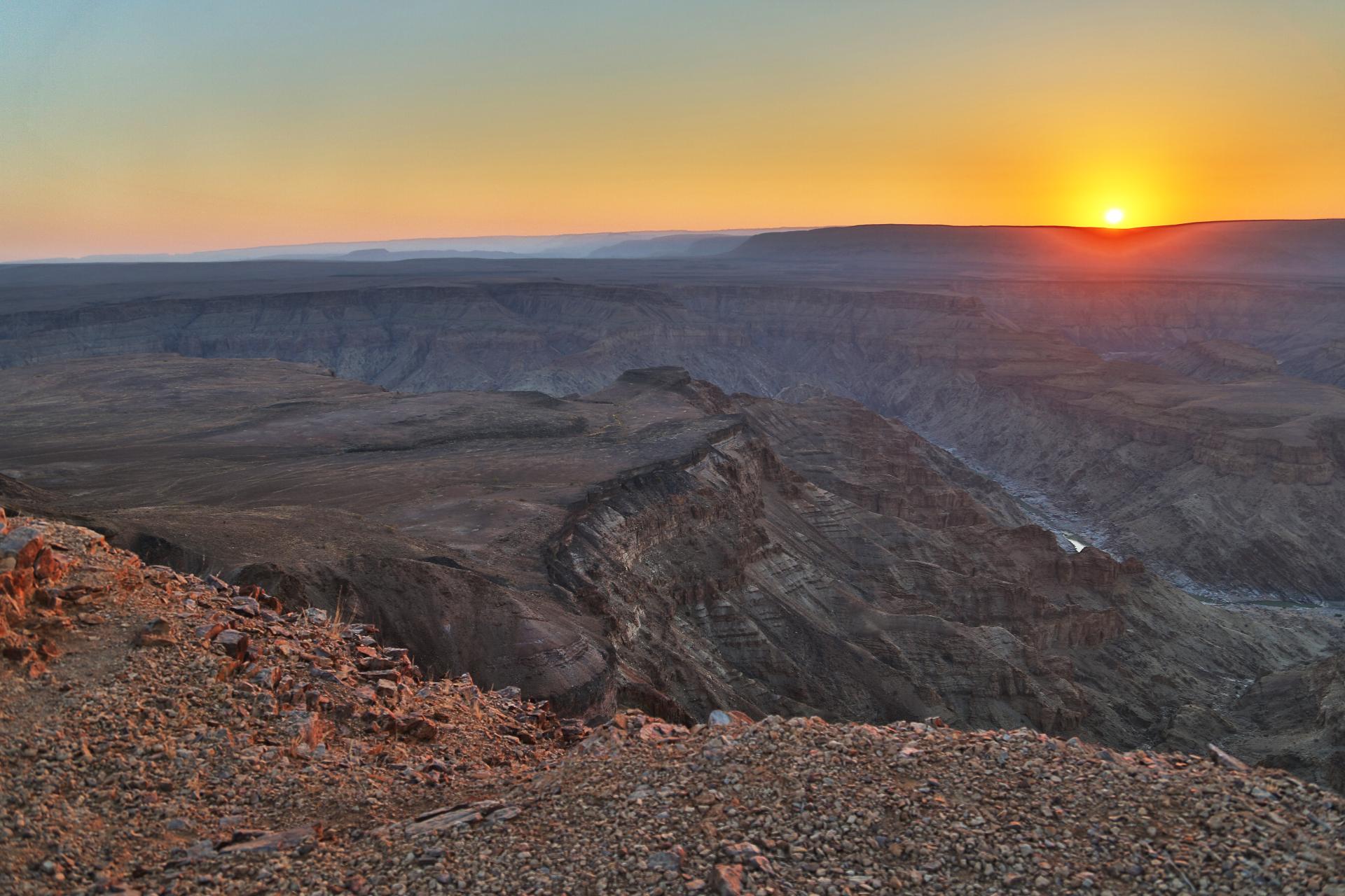 6. den: FISH RIVER CANYON: 2. NEJVĚTŠÍ KAŇON SVĚTA: Po snídani překročíme Orange River, řeku „diamantů“, nejdelší tok Jižní Afriky. Zastávka a možnost koupání v termálních pramenech Ais Ais. Chvíli nato se ocitneme v divoké krajině rezervace Ritchveld a na dosah Hadí řeky, která záhy odhalí produkt své tisícileté práce – totiž Fish River Canyon, druhý největší kaňon planety. Se západem slunce opustíme působivé vyhlídky natěšeni na amarulový koláč v nedalekém Canyon Roadhouse.