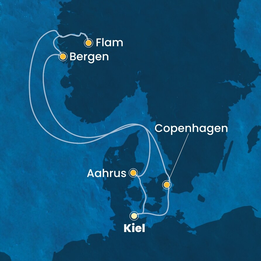 Kiel (Německo) - Kodaň (Dánsko) - Flam (Norsko) - Bergen (Norsko) - Aahrus (Dánsko) - Kiel (Německo).