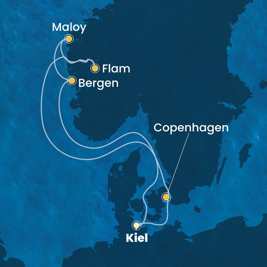 Kiel (Německo) - Kodaň (Dánsko) - Flam (Norsko) - Maloy (Norsko) - Bergen (Norsko) - Kiel (Německo).