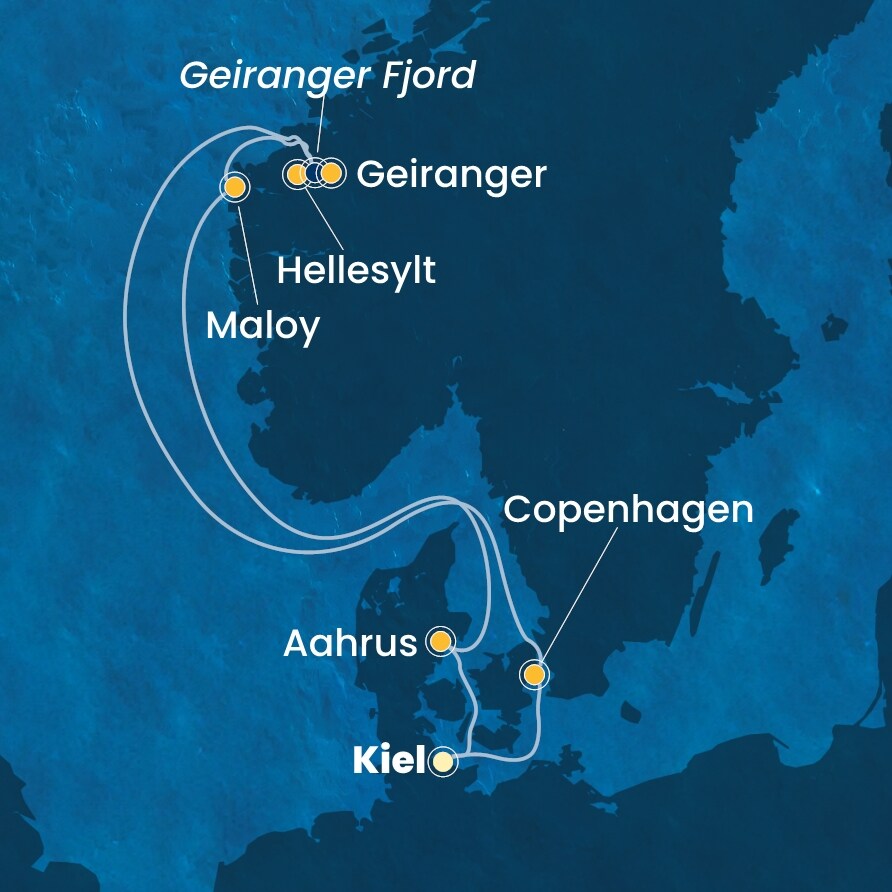 Kiel (Německo) - Kodaň (Dánsko) - Hellesylt (Norsko) - Geiranger (Norsko) - Maloy (Norsko) - Aahrus (Dánsko) - Kiel (Německo).
