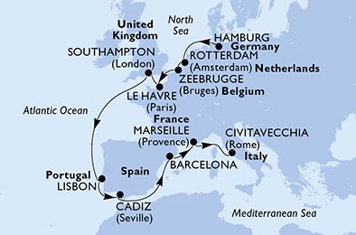 | 10. den | Cadiz (Španělsko) | 11:00 | 21:00 |