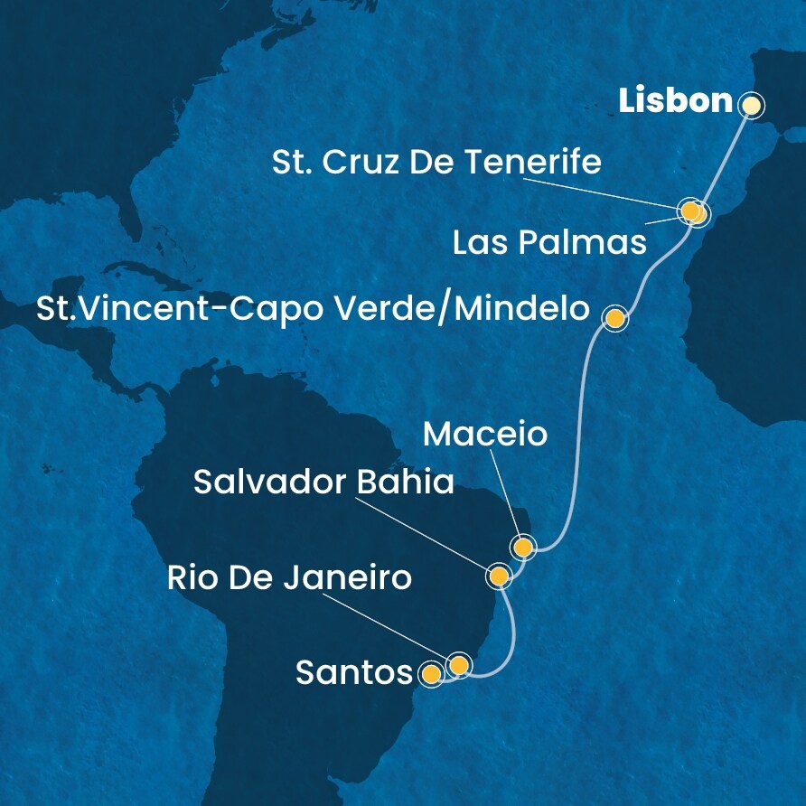 | 13. den | Salvador de Bahia (Brazílie) | 07:00 | 13:00 |