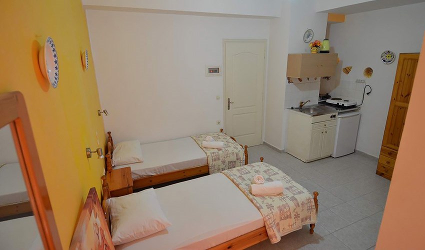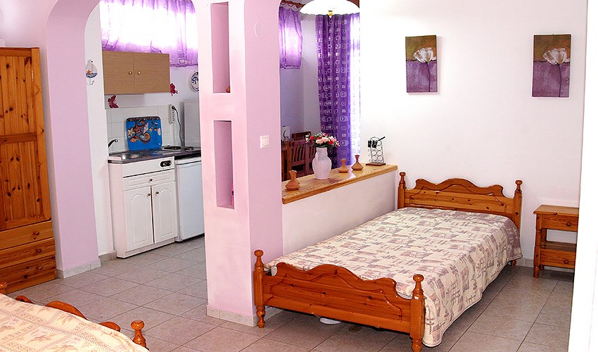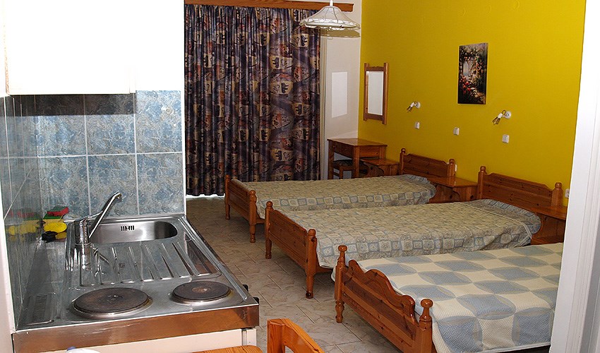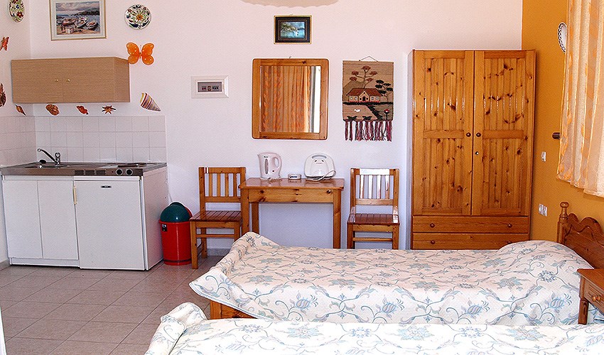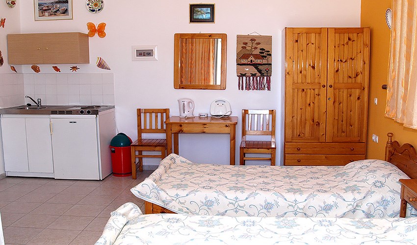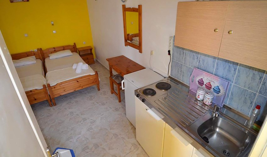 kuchyňský kout (vařič, varná konvice, lednice, základní nádobí)