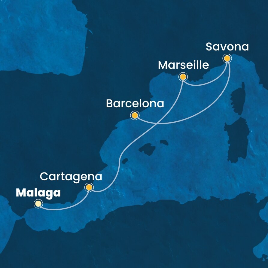 Malaga (Španělsko) - Cartagena (Španělsko) - Marseille (Francie) - Savona (Itálie) - Barcelona (Španělsko).
