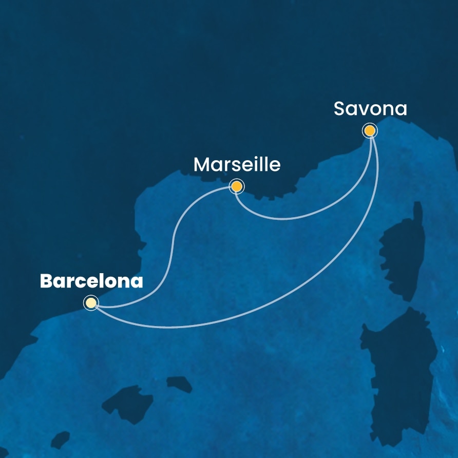 Barcelona (Španělsko) - Savona (Itálie) - Marseille (Francie) - Barcelona (Španělsko).