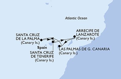 | 2. den | Las Palmas (Španělsko) | 07:00 | 19:00 |