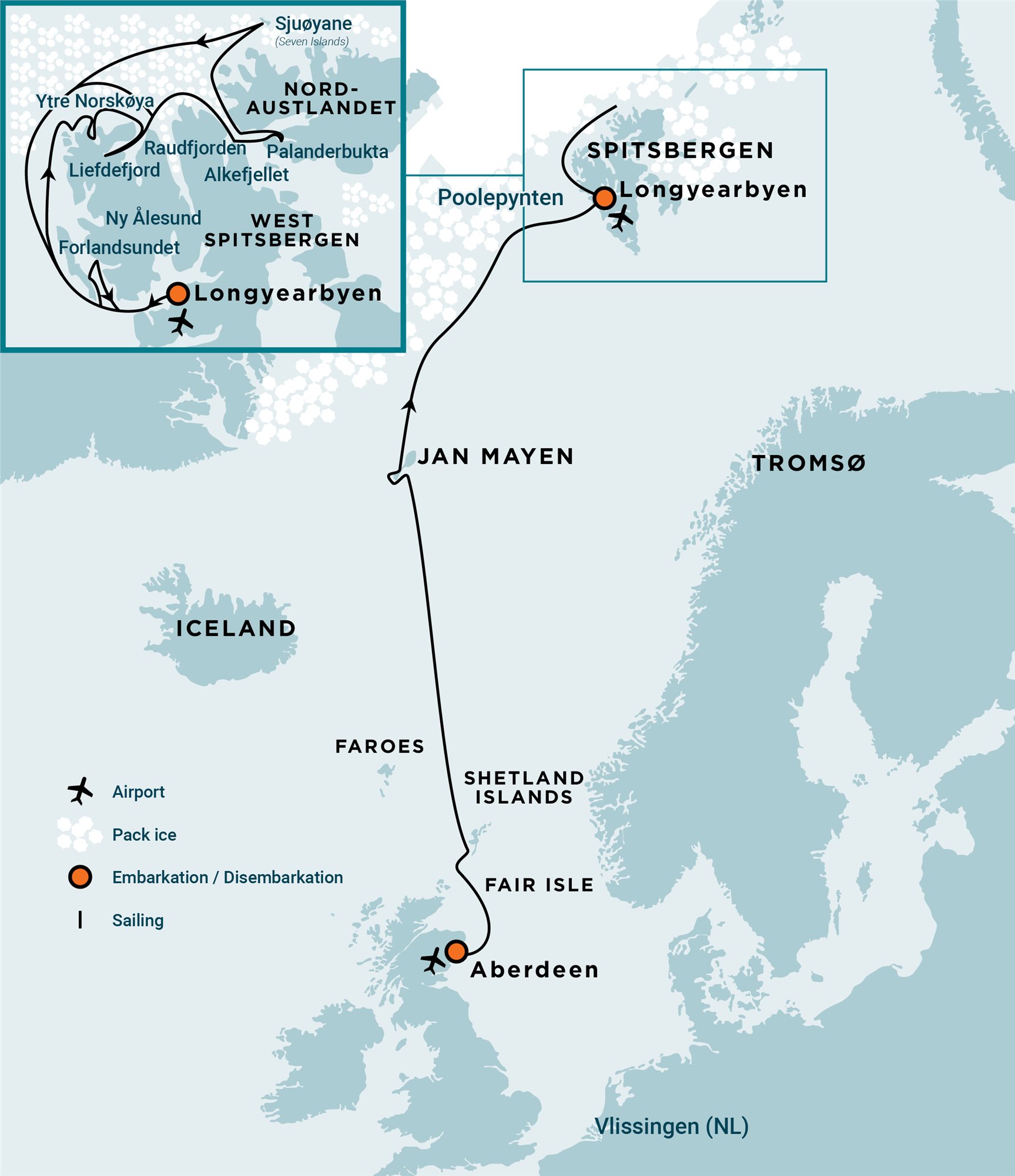 • transfery mezi letištěm, hotely a lodí pouze pro cestující na skupinových letech do Longyearbyenu a zpět