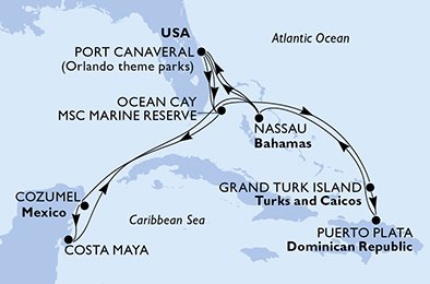 | 2. den | Ocean Cay MSC Marine Reserve (Bahamy) | 08:00 | 18:00 |